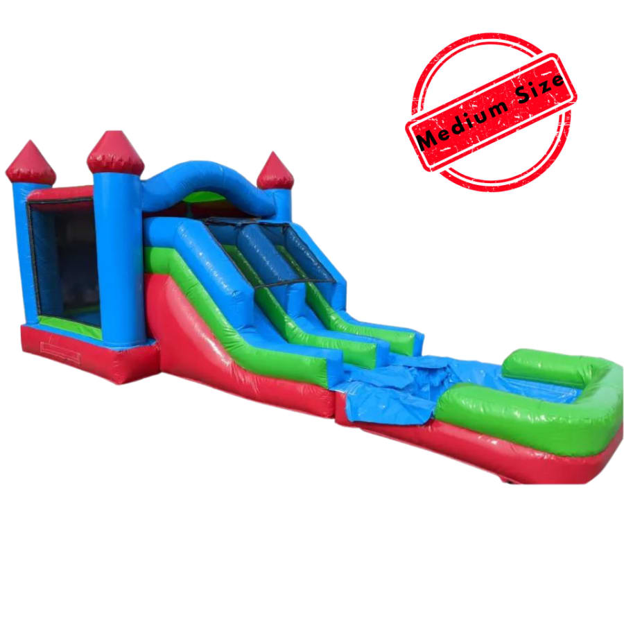This bouncy castle comes with a slide and pool and it is an inflatable play structure designed for kids that is compact in size but packed with fun. It features a bouncing area, an attached slide, and a pool at the bottom of the slide for a complete play experience. The compact design of the bouncy castle makes it easy to set up and transport, making it a great choice for smaller events and backyards. This type of bouncy castle provides a fun and interactive way for kids to play and stay active. It is great for smaller children but can handle all ages. 9 ft height allows for indoor use in some settings. Can be used wet or dry. Check out these bouncy castles in different color variations French Fries with Blueberry & Ketchup, Space Jam and Little Mermaid