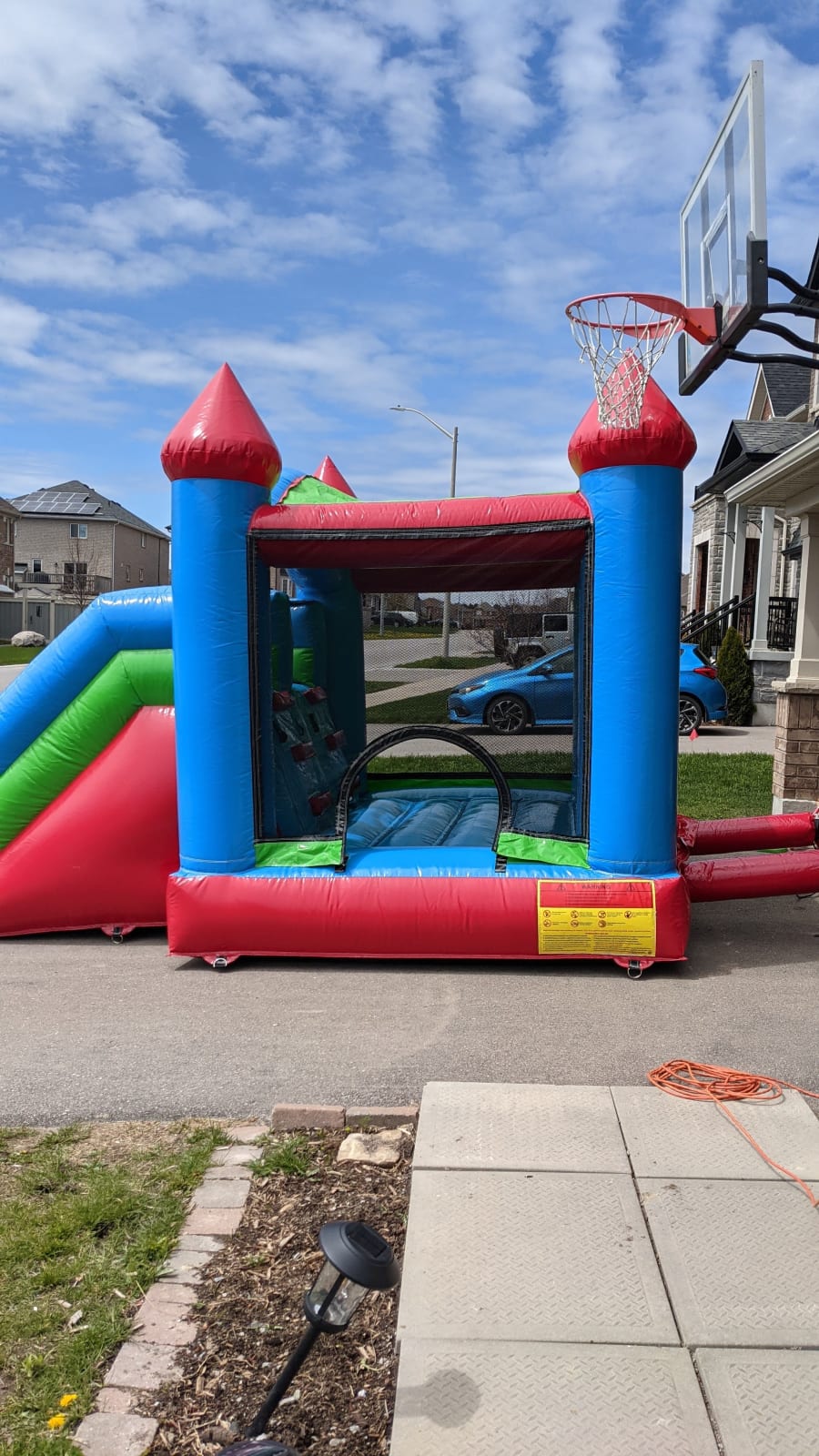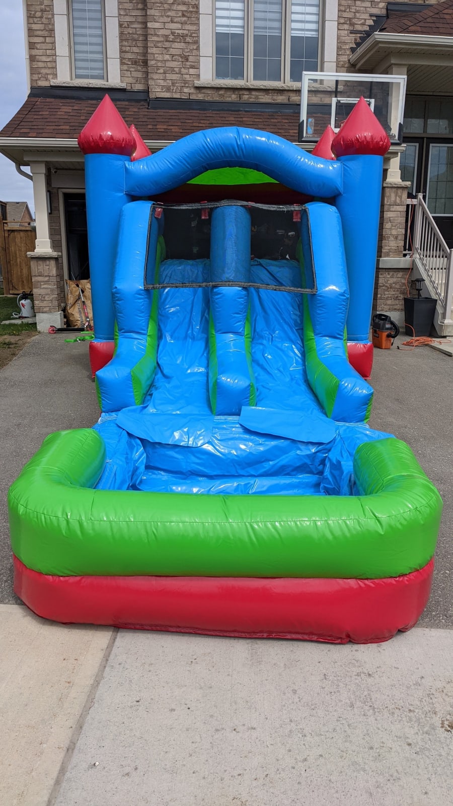 Every rental comes with a blower to inflate the bouncy castle, stakes/pegs to anchor your inflatable to the ground ( if bouncer is on a hard surface where stakes cannot be used sandbags can be provided at an additional cost) and tarps if needed. All you need is the space and an outlet to plug your blower into. Recommended items to have on hand - extension cords, a dolly or cart to move your bouncer to your set up area and of course kids who love to have fun! *this inflatable requires a water garden hose, which is to be attached to the hose straps on the unit*