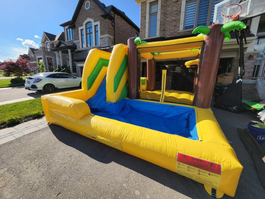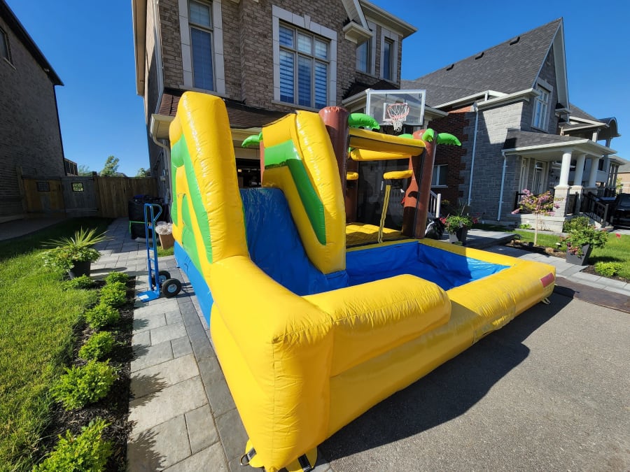 This Paradise Island is sure to make you feel like you are in your own tropical paradise. With a slide, pool, and bounce area this multi-functional inflatable play structure designed for kids is sure to keep them occupied for hours. The castle features a large bouncing area for kids to play and jump, as well as a steep slide leading into a pool for added excitement and cooling off on hot days. The tropical "Paradise Island" design, complete with palm trees just requires crystal-clear water! It provides a visually appealing backdrop for play and fun and is sure to provide hours of active, engaging entertainment for kids. Perfect for all ages.
