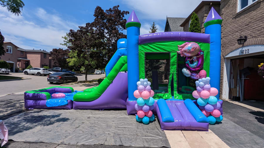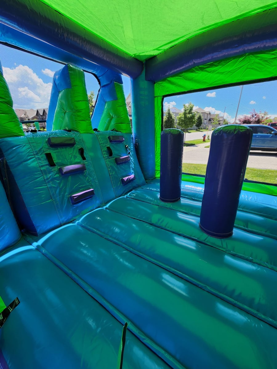 A purple, green, and blue bounce house with basketball nets, obstacles, a slide, and a pool is a multi-functional inflatable play structure designed for kids. The castle features a large bouncing area surrounded by high walls and decorated in a vibrant purple, green, and blue color scheme. The structure also includes basketball nets for a fun and interactive shooting experience. The attached slide leads into a pool for added excitement and a refreshing way to cool off on hot days. The Peacock provides a complete play experience for kids. It is suitable for all ages and can be used wet or dry. Please check out Key Lime with Cherries, McSlidey, Princess Cake, Princess Cake 2.0 and X-Mas in July for color variations.