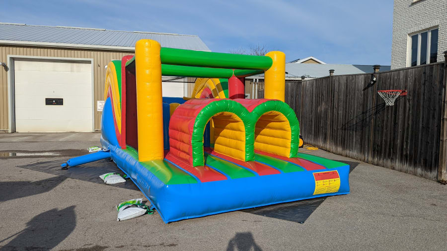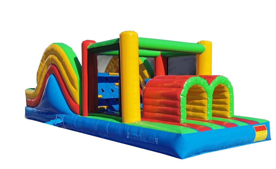 This colorful obstacle with a slide is a play structure that offers a fun and challenging experience for kids. It features a variety of obstacles such as tunnels, a climbing wall and slide, designed to test the agility and coordination of children. With its bright eye-catching colors, it makes a visual appealing addition to any event. The slide adds an extra layer of excitement and provides a fun way to exit the bouncy. This bouncy is ideal for outdoor events and provides hours of active, engaging fun for kids. It is perfect for all ages.