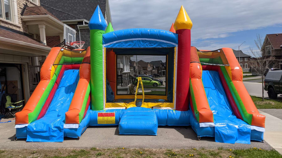 Double Trouble more like Double Fun! This double slide bouncer features a large bounce house with slides on either side. It is a play structure that offers a variety of fun and interactive features for kids. The main body of the bounce house is designed for jumping, bouncing, and playing, while the attached slides on either side provide an exciting way for kids to exit the structure. These slides can be used for races or for kids to enjoy independently. It can be used either wet or dry. This one is sure to be the talk of the party, the kids just love how big it really is! It comes with detachable pools and it is suitable for all ages.