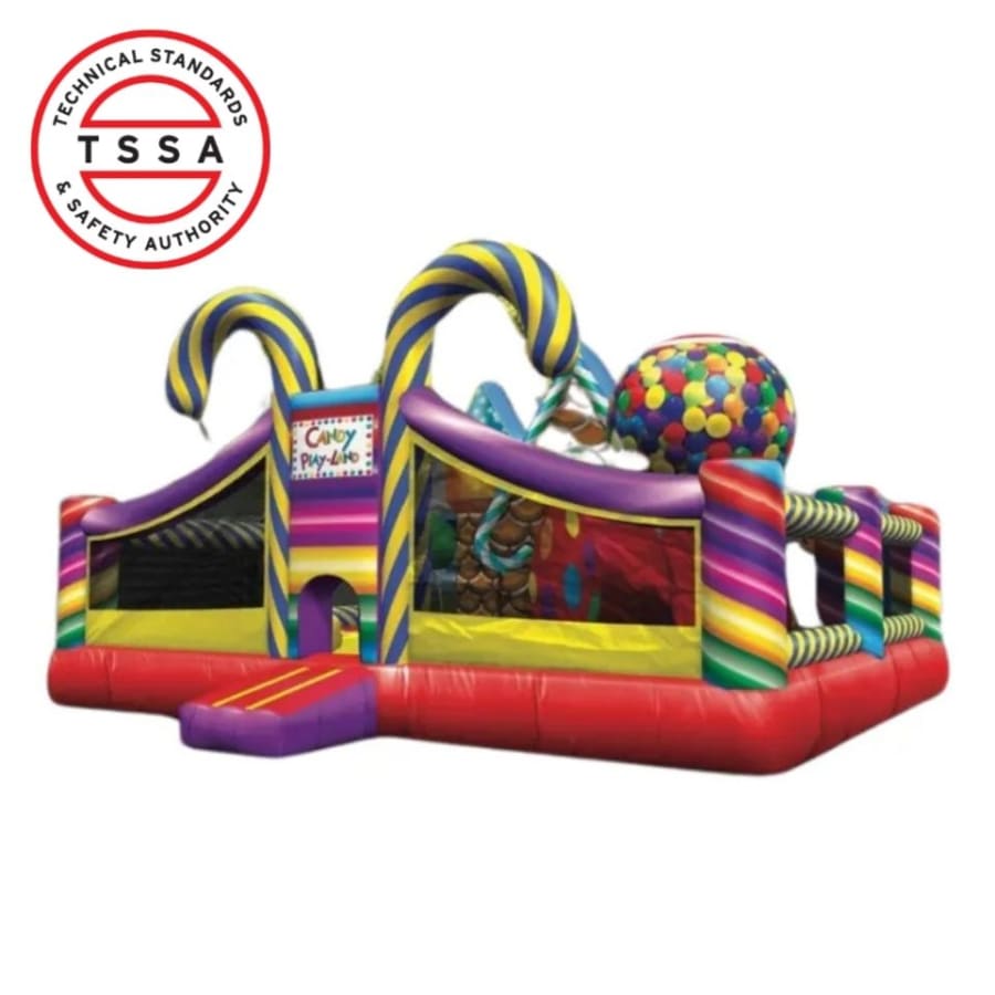 Step into a whimsical world of sugary delight with Candyland, our newest inflatable castle! 🍭🍬 Perfect for residential use at this time. Will be TSSA certified for non-residential use soon! This inflatable features a towering gumball machine display, a thrilling slide, and colorful candy images that will transport you to a land of confectionery dreams. 😍