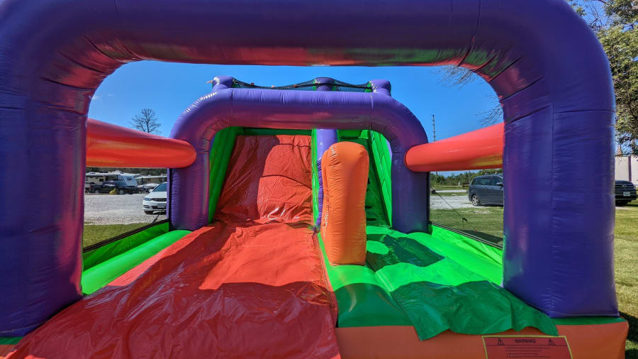 Every rental comes with a blower to inflate the bouncy castle, stakes/pegs to anchor your inflatable to the ground ( if bouncer is on a hard surface where stakes cannot be used sandbags can be provided at an additional cost) and tarps if needed. All you need is the space and an outlet to plug your blower into. Recommended items to have on hand - extension cords, a dolly or cart to move your bouncer to your set up area and of course kids who love to have fun!
