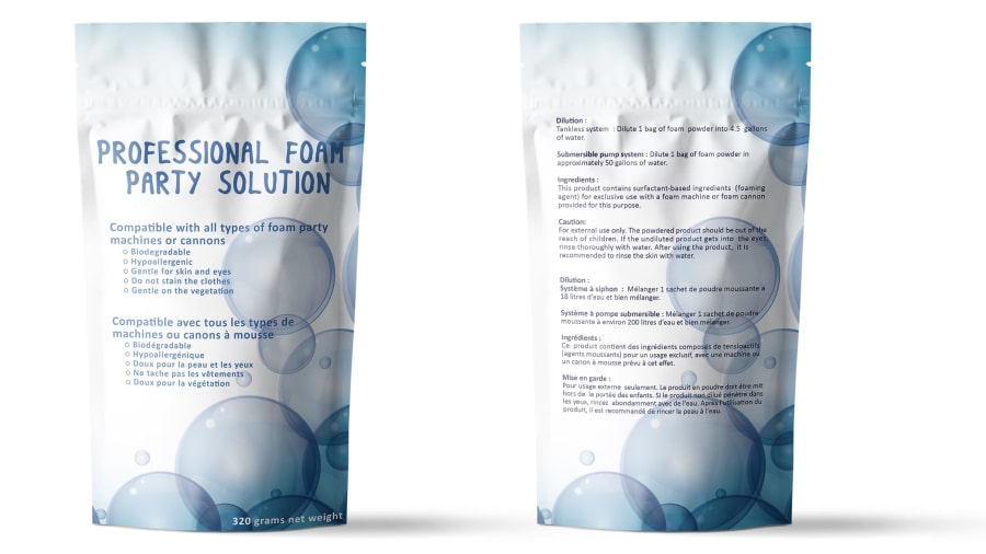 One bag of powder mixed into a 5-gallon container will run the foam machine continuously for about 45 minutes. The time may vary depending of the flow and water pressure. Normally, for a residential children’s party, we suggest 2 bags of powder for a whole afternoon. Customer will stop and start the machine at certain times because there will be too much foam. It will alternate the operation of the device.