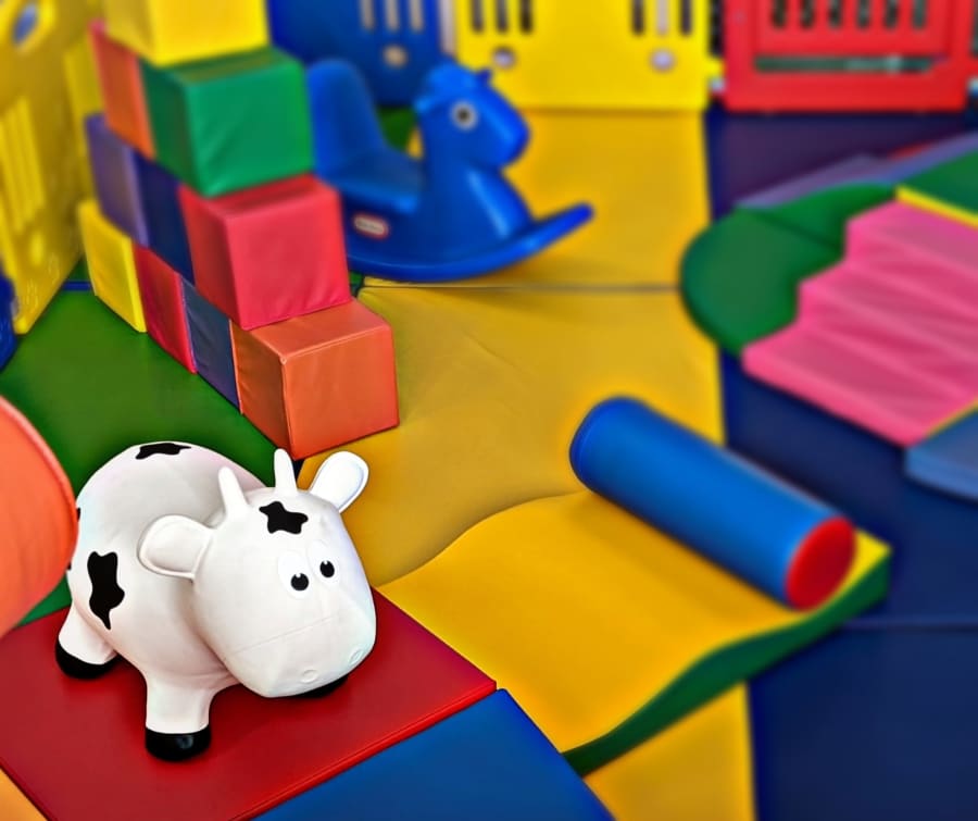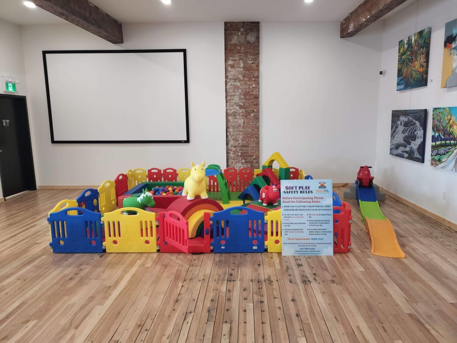 Soft Play blocks, animal hoppers, soft play climbers, roller coaster, slide, small ball pit, rainbow soft play, fence and mats.