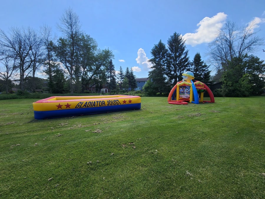 Every rental comes with a blower to inflate the bouncy castle, stakes/pegs to anchor your inflatable to the ground ( if bouncer is on a hard surface where stakes cannot be used sandbags can be provided at an additional cost) and tarps if needed. All you need is the space and an outlet to plug your blower into. Recommended items to have on hand - extension cords, a dolly or cart to move your bouncer to your set up area and of course kids who love to have fun!