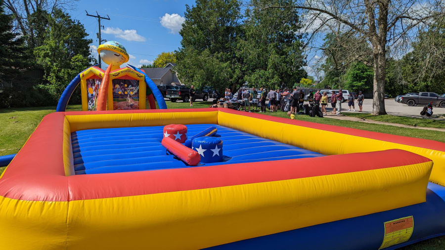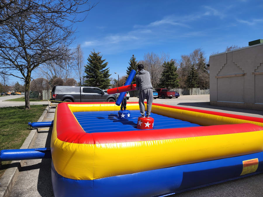 The Jousting Ring is the ultimate sparring interactive inflatable game it is great for kids and adults. Use the giant jousting inflatable poles to knock your opponent off their podium while maintaining your balance. Let's put you to the test for battle! The soft bouncy area makes dropping of your podium a safe and fun experience.