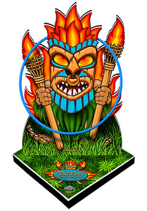 The Tiki Toss Game is a classic ring toss style game where players try to swing and land a ring onto a hook target mounted on a tiki-style board.